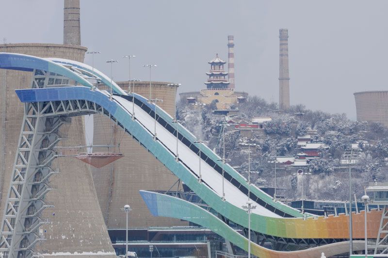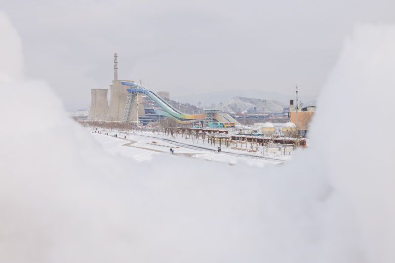 大跳台身披银装,首钢园区内的工业建筑相映成趣。