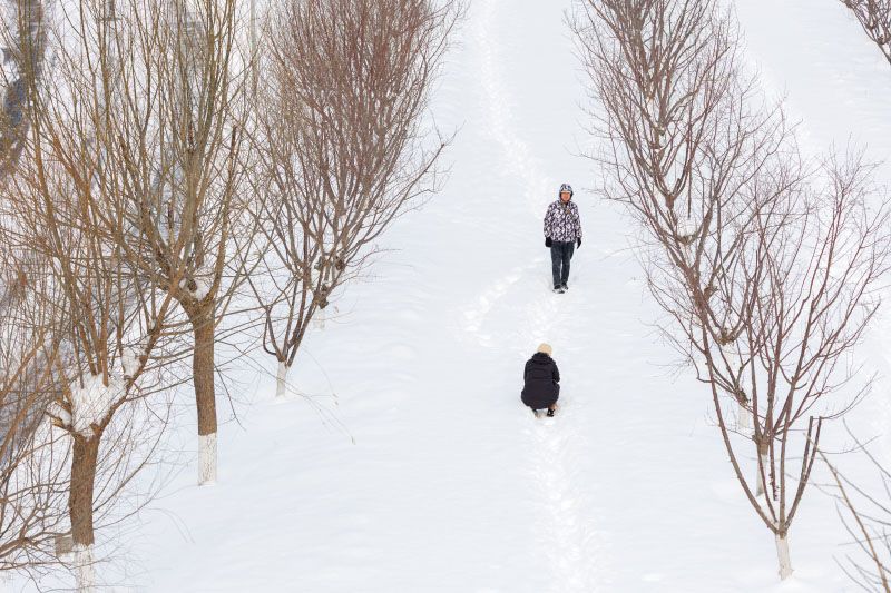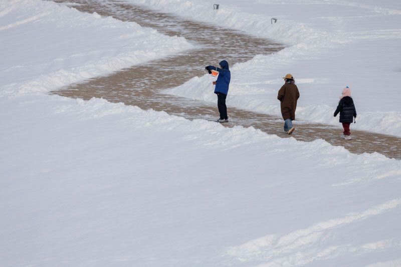 市民在雪地边走边拍,不愿错过这难得的冬日限定美景。