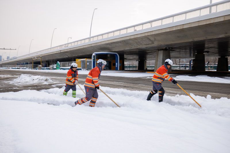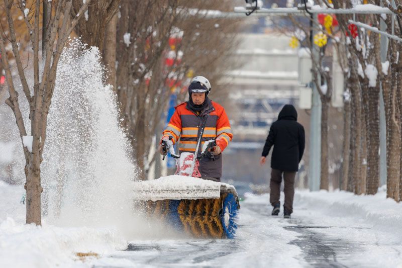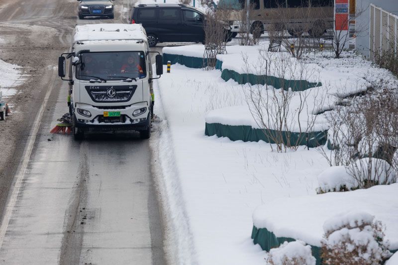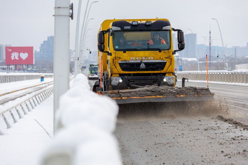 工作人员清扫道路积雪。扫雪铲冰严格按照融雪剂施撒要求,在城市主次干道交通路口、桥区、匝道、坡道、弯道等重点区域预撒布融雪剂,防止道路结冰,保障交通顺畅。