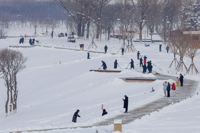 莲石湖生态公园,工作人员清扫道路积雪。各类公园广场积雪清理按照“宜留则留、宜扫则扫”的原则开展,让市民游客获得更舒适的赏雪体验。由广场、园区日常清扫保洁作业单位落实扫雪铲冰主体责任,重点保障公园、广场主出入口、主园路、台阶等区域,采取人工或机械设备方式除雪。