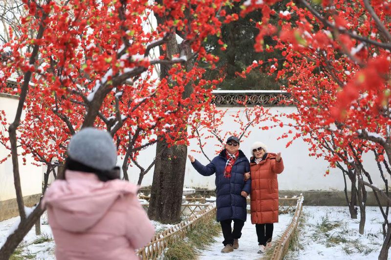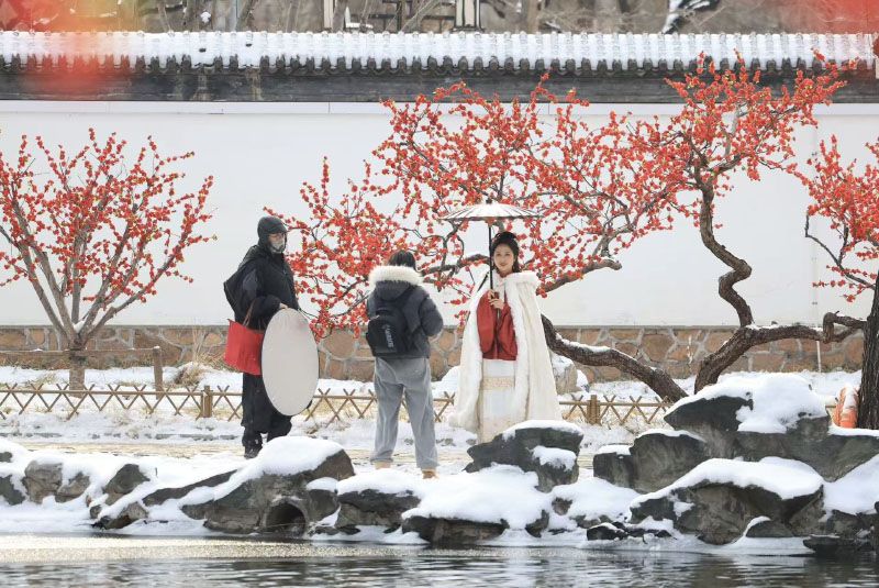 1月18日,雪后,北京大观园的亭台楼阁尽数披上银装,身着汉服的游人穿行其间。