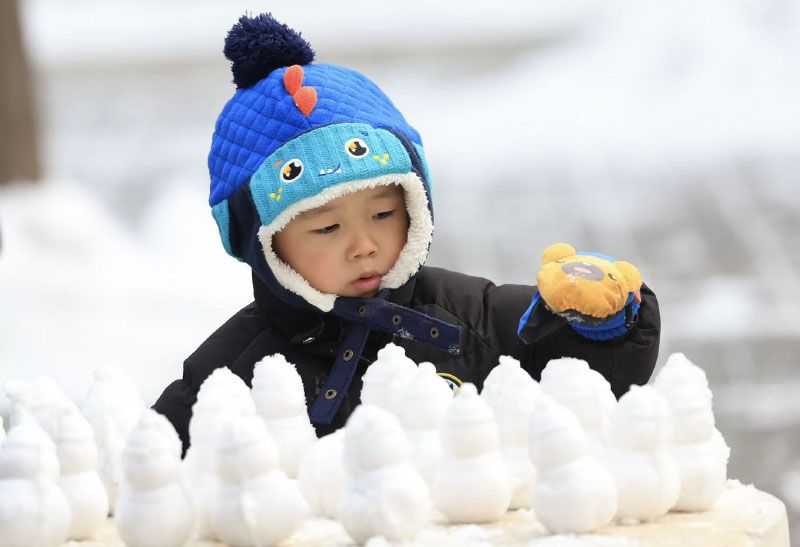 小朋友精心堆起小雪人。