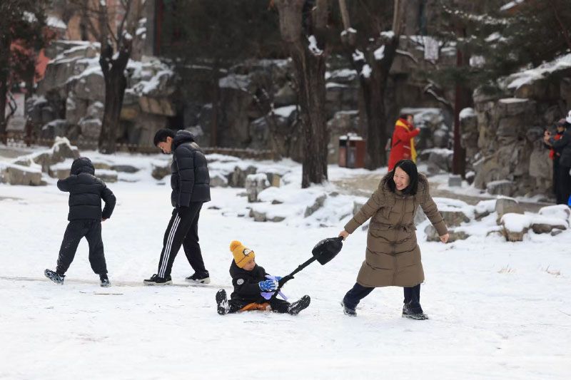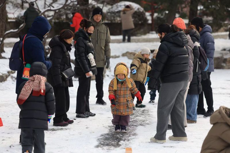 家长牵着孩子在雪地里撒欢儿。