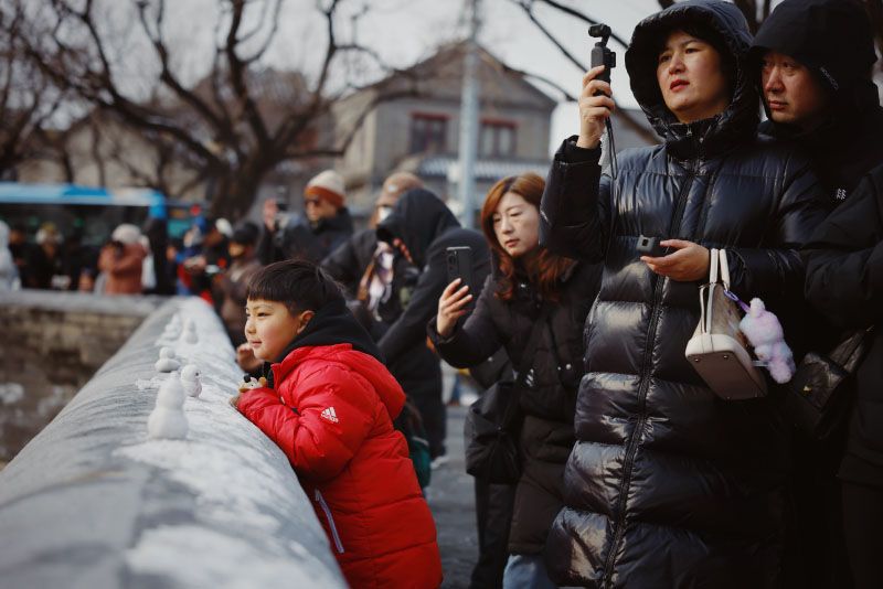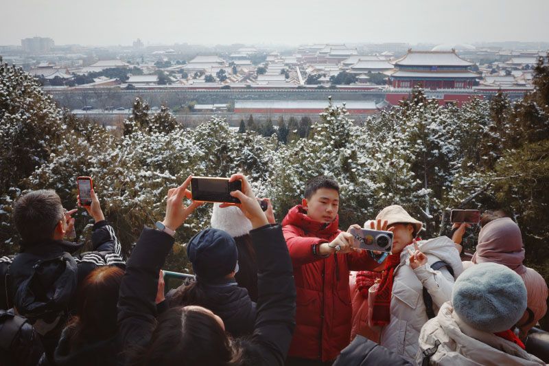 1月18日,一场落雪后,景山上挤满了赏景的游客,大家争相将雪后故宫的景致纳入镜头。