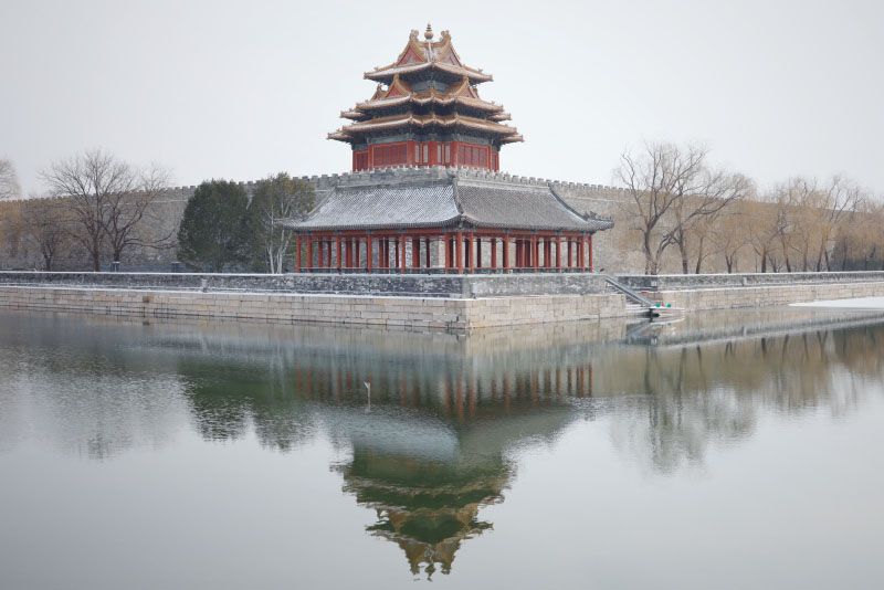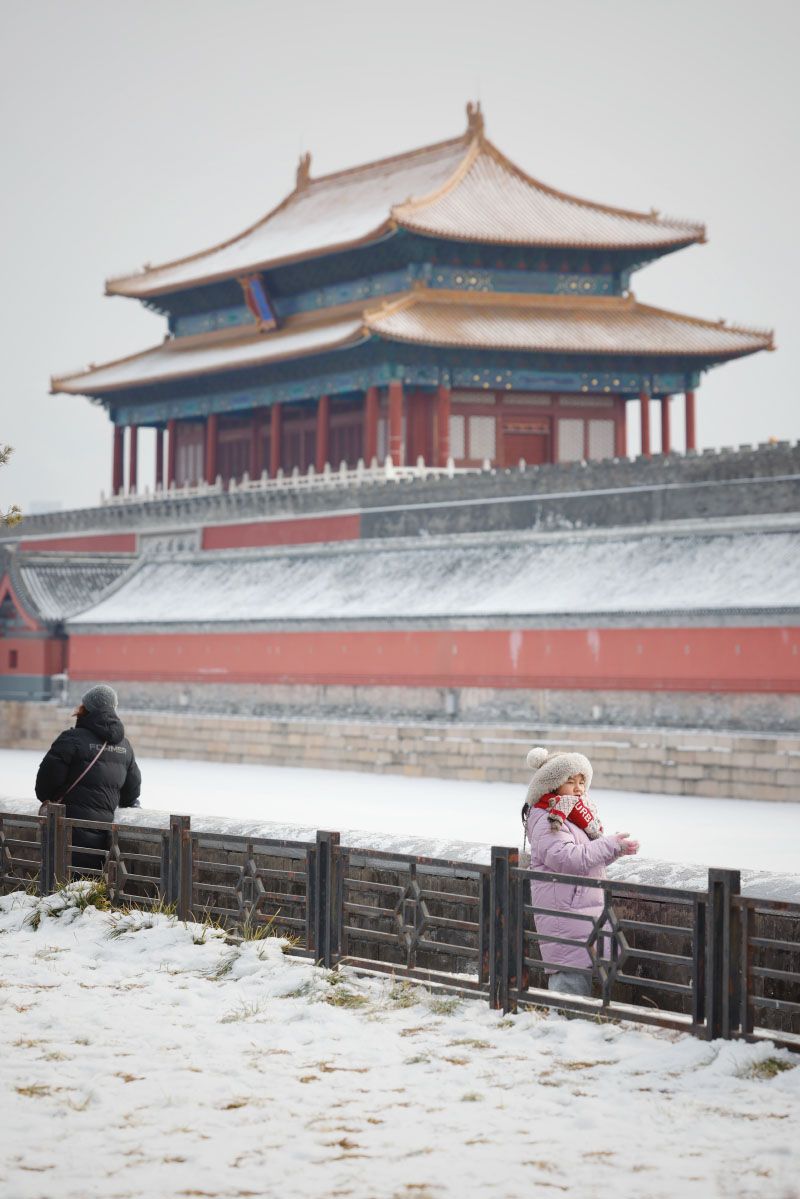 故宫北门外,白雪覆盖了宫墙与护城河。