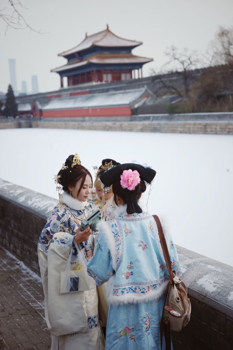 三位身着古服的女孩儿与雪景融为一体。