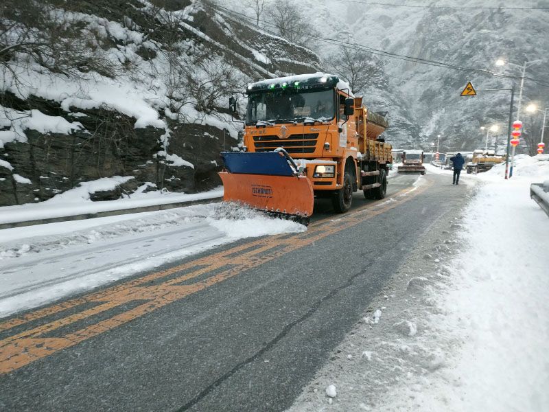 1月18日,养护集团在重点道路上投入使用新型、大型除雪设备开展作业。图为房山区京昆线除雪作业 。