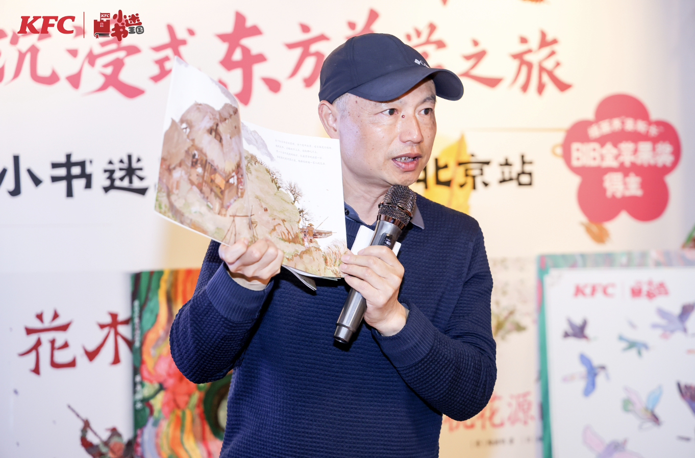 阿甲老师还分享了《桃花源的故事》,他认为这部浸润着浓郁乡土气息的作品,代表着蔡皋图画书艺术的巅峰成就,其图像叙事完美呈现了陶渊明《桃花源记》的故事与意境,画面中藏着富有童趣的游戏细节,同时也十分契合古文原文的叙事节奏。他通过现场示范,建议家长和老师可以借助这本书带着孩子一起诵读古文,从合作创造的声音和图像氛围中感受传统文化经久不衰的魅力。