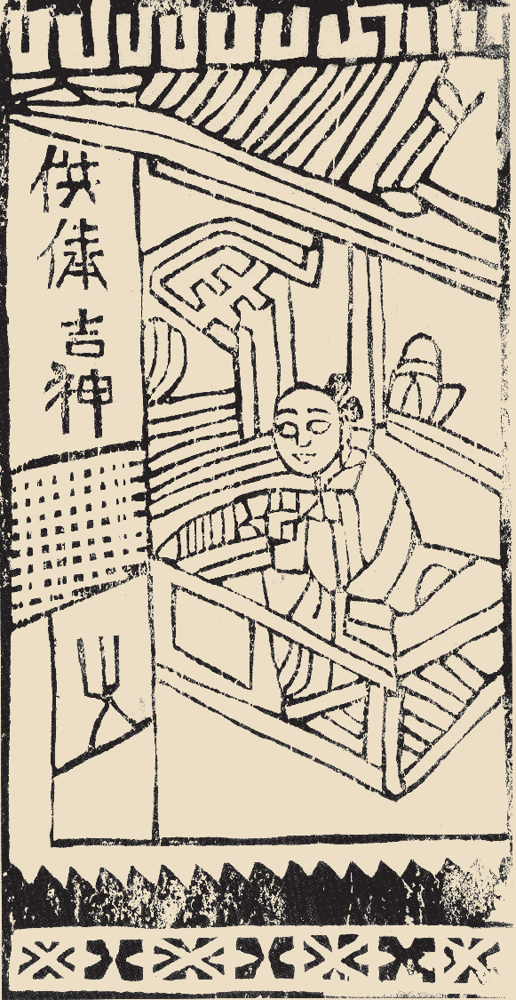 原始社会人类祖先无衣遮体,无屋可居。《世本》谓:“伯余作衣裳。宋衷曰。黄帝臣也。”又,古文献中,以黄帝之妻嫘祖(西陵氏之女)发明养蚕治丝之法,北周(557—581)后,被祀为蚕神。人们有了丝织衣裳,皆归功于上古黄帝时代。缫丝织帛,亦始于嫘祖。陈步武《大竹县志》:“玄女宫在城南上顺城街,嘉庆十七年建……神为黄帝元妃,业缫丝者祀之。一称机神庙。”据此可知此图之“机神”当是黄帝元妃嫘祖。图中上有瓦顶屋檐高遮,屋内开有方形小窗,一架织机放于中间。“机神”坐其旁在投梭织帛,上题“供俸吉神”四字,疑是“供奉机神”之误。线刻简要,颇富民间版画韵味。