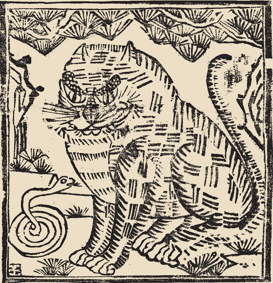 古时云南丽江一带山中多毒蛇猛兽,猎人入山,尤其需要神灵保佑,虎为百兽之王,当地人认为祭祀白虎可以驱逐其他有害兽类。此外,此地纳西族又认为虎与该族创世纪之说有关,故也将其作为门户的守卫神。图绘一只凶恶的猛虎张口怒目,正俯视地上一条盘曲昂首的白蛇,十分生动传神。背景是松树、草木与峭壁,描绘虽然简略,却成功地渲染出一种深山的凛然之气。