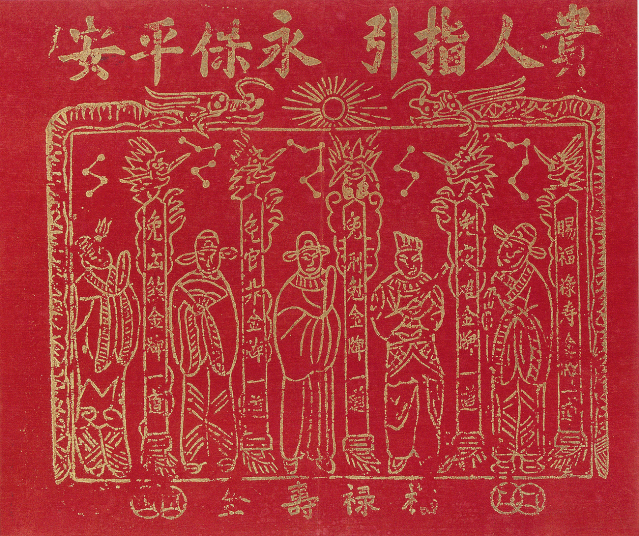 广东广州市南番禺县,因城内有番山和禺山而得名。地近浮丘山,相传为浮丘丈人得道处。清屈大均《广东新语》:“浮丘去城西一里,为浮丘丈人之所游……丘前有撒金巷,予家尝近焉,儿时数就珊瑚井旁嬉戏,为谣曰:‘浮丘叔、浮丘丈人同一目;撒豆成金人不知,肩上珊瑚担一束。’”相传有仙人遗以麦豆,撒之成金,视所荷之薪,则红白珊瑚金也。因此神话传说,番禺民俗版画多是预兆发财致富之作。此图刻绘古代文武官员装束之神五位,龙头符牌五道。牌上刻印“赐福禄寿全金牌一道”“免灾难金牌一道”……图上有“贵人指引 永保平安”,图下刻“福禄寿全”四字,是新年祈财禳灾必备的民俗版画之一。