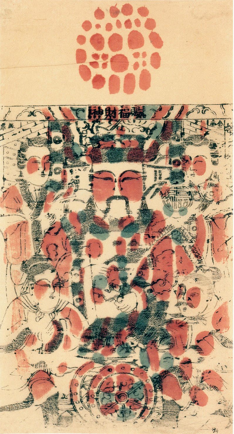 民俗版画中,财神图像分为文财神、武财神两种,云南及闽粤一带多奉武财神,北方则是文财神。此外,东北辽、吉、黑等地,还有财公财母,老、少财神,这类财神都是“仙家”(狐、鼠、貂、猬),反映了过去贫穷人多,希望在新年时财神降临,来年运转。浙江余杭是民俗版画产地之一,刷印的纸马艺术历史悠久。此图中的“赐福财神”之形象与京津一带相似,不同者是神下还有一脚力推来一车珠宝,一壮士抱拳迎接,象征财宝送上门来,以符合“赐福财神”之标题。财神两旁的侍者为二宫女(其他地方纸马中,则无此画法),女侍一托“福”字,一托宝物。图上的“金库”“银库”,是财神特有的象征。
