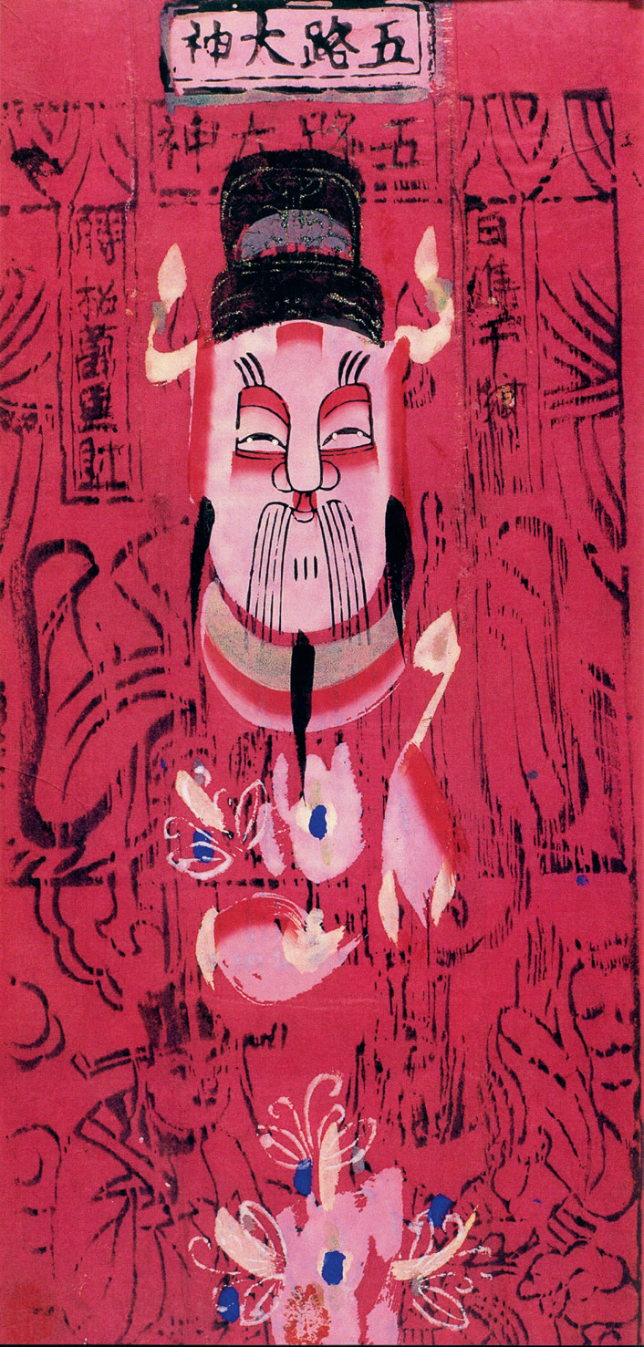 图中五路大神戴乌纱官帽,穿圆领官衣,怀中抱一如意,手托一元宝,坐在神帐内。左右配有“日进千乡宝,时招万里财”对联一副和“五路大神”一横批。神之座前,一侍抱笏立于下方。此图为求财祈福之神,故以梅红纸先刷出木刻墨线图像,而后手工开脸,复印须眉和银色纱帽线纹,是无锡纸马中工序较多的一种精品。(按:《无锡县志》五路神姓何,名五路,元末,御倭寇死,因祀之。又:正月初五为路头神诞辰。金锣爆竹,牲礼毕陈,以争先为利市,必早起迎之,谓之接路头。)蔡云《吴歈》云:“五日财源五日求,一年心愿一时酬。提防别处迎神早,隔夜匆匆抢路头。”(《清嘉录》)“五路大神”之说,仅见于江南,北方及其他等地罕有。或因何五路为御倭寇侵犯江苏沿海而牺牲,民间借祭祀五路而求财,选定正月初五为神诞,约定俗成,并刻印“五路大神”来奉祀。