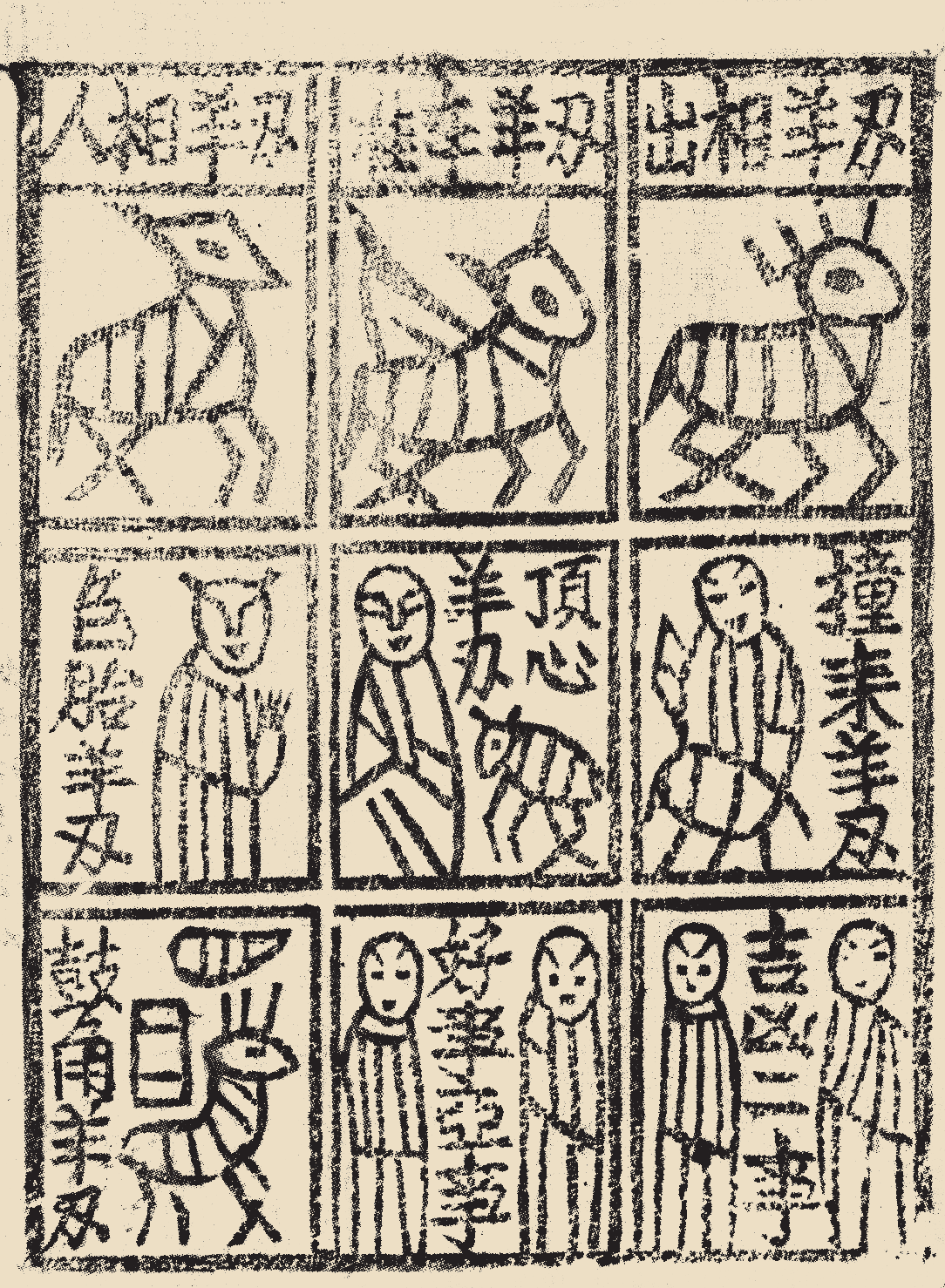 再有就是南方的纸马与北方各地刻印者,多少也有些区别,如南方福建、广东、广西等地新年出现的纸马,有《四方大利》《财神真经》《集福迎祥》《禄马扶持出入平安》等。这些纸马反映了两广与闽南一带务商者多,所以纸马的内容以发财和出外平安、离家有贵人相助者为主。其次则是些属于新年民俗活动的纸马了,如香港、广州的“祭白虎打小人”,在祭纸里就有“贵人指引”符、“小人纸”“化解消灾”符等木版刻印的纸马。广州人喜好烹调美味,新年时饮宴过饱,肠胃不适,则有一种刻印着山羊和人物的《出相羊刃》纸马。据说焚化成灰,服后则病愈。小孩吃多,则另有各种神符可以化解。图上人物绘刻皆有风趣,为其他各地所无。