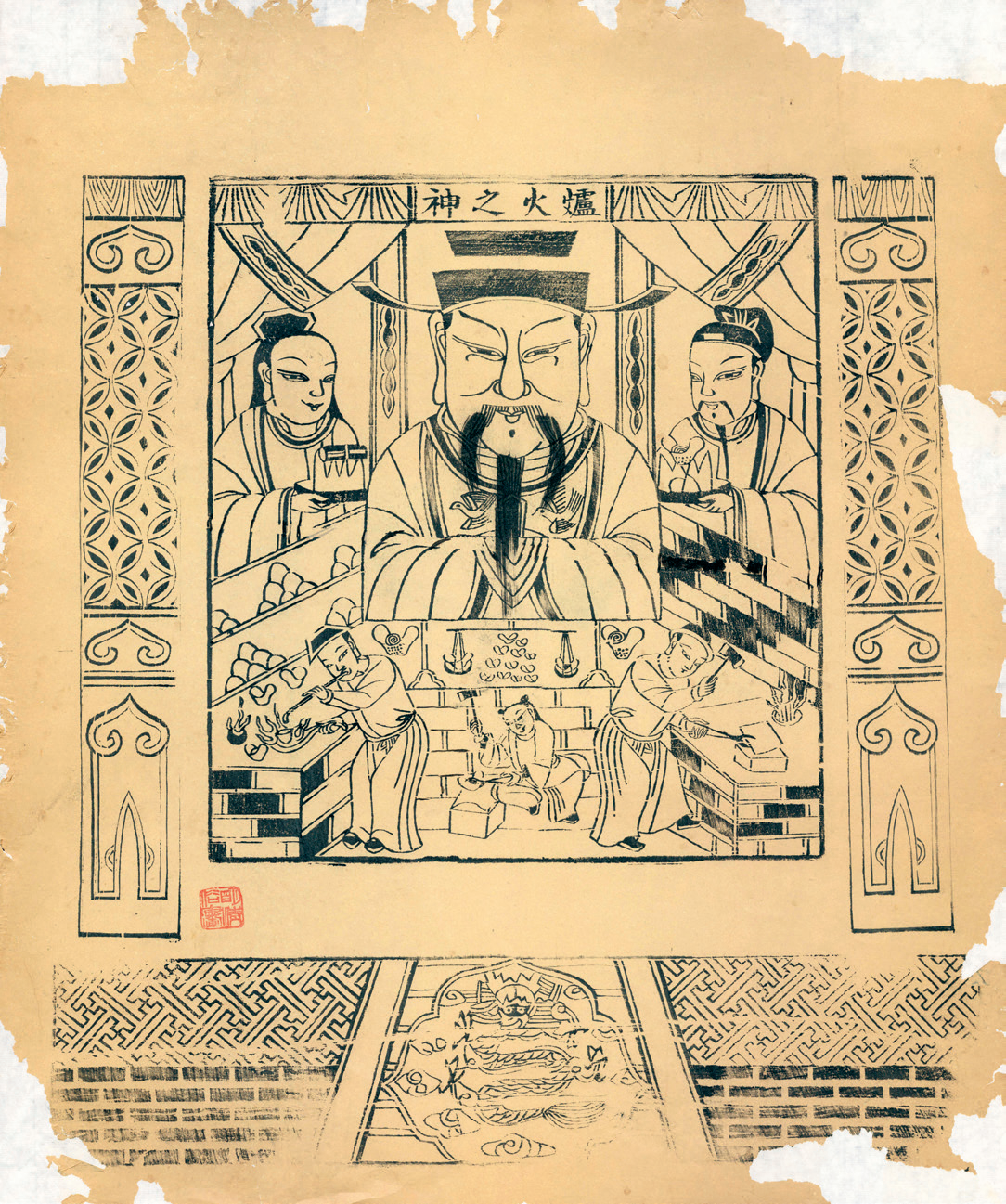 图中一位戴展翅乌纱,身穿圆领一品官服的朝官居中而坐,神案上有一架天平及元宝若干;下方刻画银炉巧匠在炼金银、铸元宝之劳动情景。此为炉火铸造行业供奉的祖师之像,常贴在银炉之旁,以祈炉火兴旺,制作工艺精巧。炉火之神相传为太上老君、尉迟恭、罗宣等人。此纸马从所画工匠劳动场景看,是为金店、银楼、首饰店所供奉者。