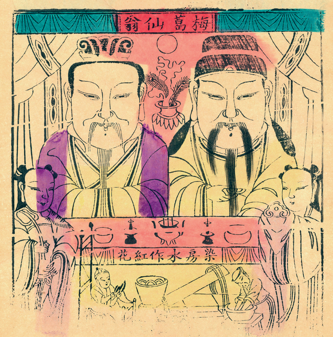 重庆梁平旧有梅葛庙,内祀梅葛二神,染布工人和刷印年画红纸艺匠尊其为祖师。关于梅葛庙之来历,据《大足县志》载:“二仙宫在城南顺上街,清乾隆五十六年建,神为梅福、葛洪,业染坊者祀之。”[按:梅福,汉朝寿春人,字子真,曾补南昌尉,元始年间(1—5)王莽专政,福弃妻子去九江,传以为仙。葛洪字稚川,晋朝句容人,闻交趾出丹砂,求为勾漏令,携子侄至广州,止于罗浮山炼丹,丹成尸解]图上左葛洪,右梅福,二仙并坐,下有工匠染布劳动之景。
