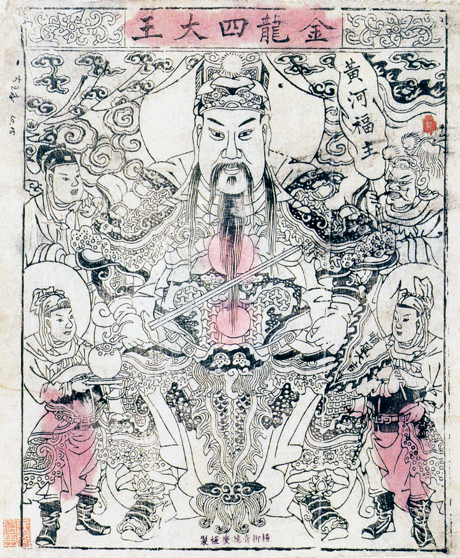 翟灏《通俗编》:“《金龙山圣迹记》:谢公绪,会稽诸生,居钱塘安溪,宋谢太后侄也。三宫北行,公投苕溪死,门人葬其乡之金龙山。明太祖吕梁之捷,神显灵助焉,遂敕封金龙四大王,立庙黄河之上。其后拥护漕河,往来粮艘,惟神是赖。”杨柳青位于南运河之末,漕运必经之地,明代又设杨柳青驿。故河之北岸建有大王庙,内塑金龙四大王。庙前建一牌坊。漕船至此,多抛锚拈香。此外,杨柳青河沿大街德庆恒纸马杂货店曾就金龙四大王塑像,雇工刻绘制版,刷印成图,供船家敬奉以保平安。