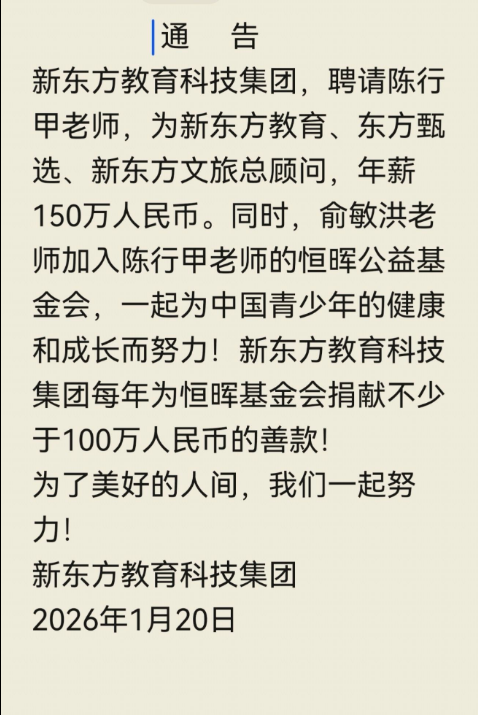 新京报讯 1月20日,新东方创始人俞敏洪通过其视频号“俞敏洪洪哥”发布消息称,“新东方教育科技集团,聘请陈行甲为新东方教育、东方甄选、新东方文旅总顾问,年薪150万人民币。”同时,通告称,俞敏洪加入陈行甲的恒晖公益基金会,一起为中国青少年的健康和成长而努力。新东方教育科技集团每年为恒晖基金会捐献不少于100万人民币的善款。