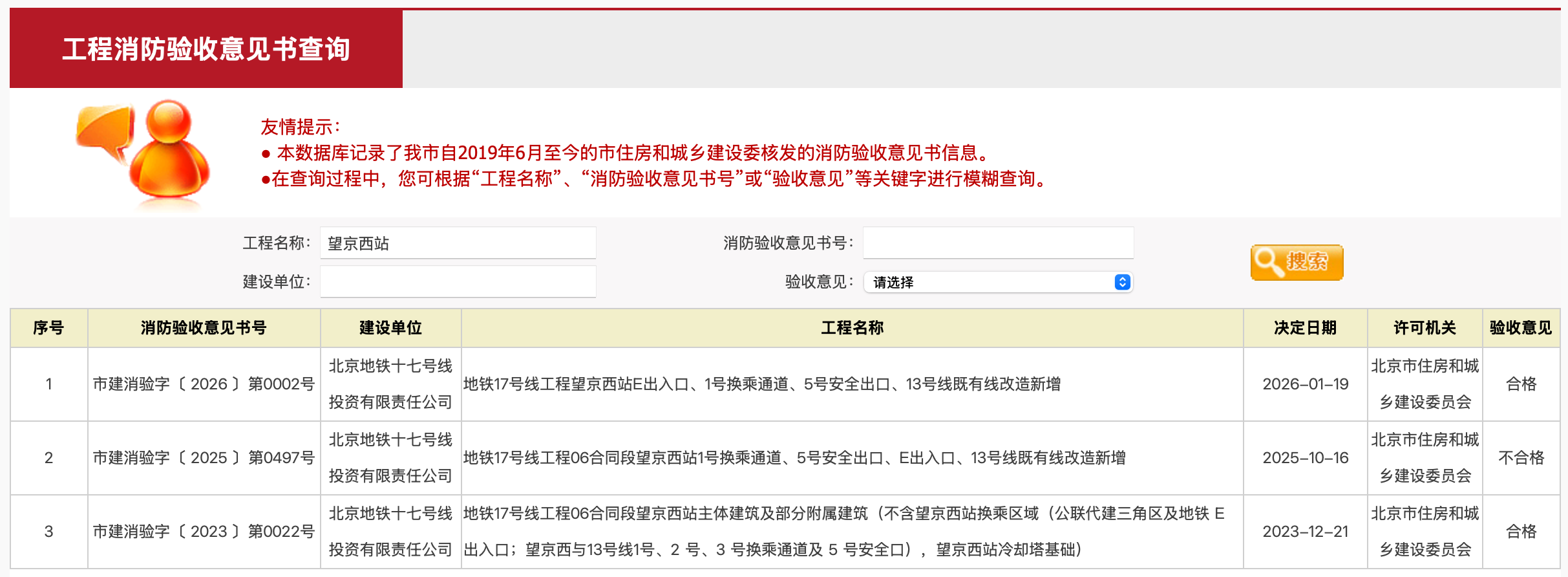 2026年1月19日,北京市住建委公示了一项消防验收意见书结果:地铁17号线工程望京西站E出入口、1号换乘通道、5号安全出口、13号线既有线改造新增消防验收合格。记者了解到,此次消防验收的通过,也标志着17号线望京西站的开通又向前迈进了一大步,距离实现13号线、15号线、17号线在望京西站的“三线换乘”也更近了。早在2023年12月,地铁17号线望京西站主体建筑及部分附属建筑的消防验收就已经通过。