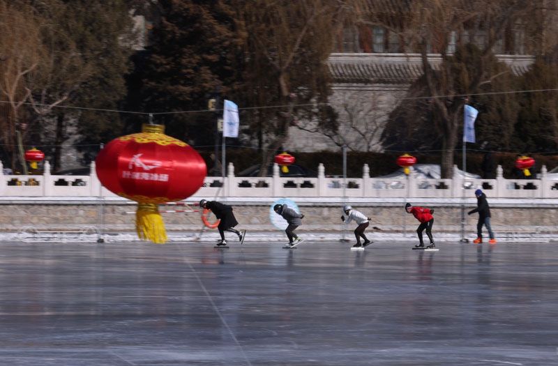 1月20日,什刹海后海冰场,游客在速滑区享受飞驰的乐趣。