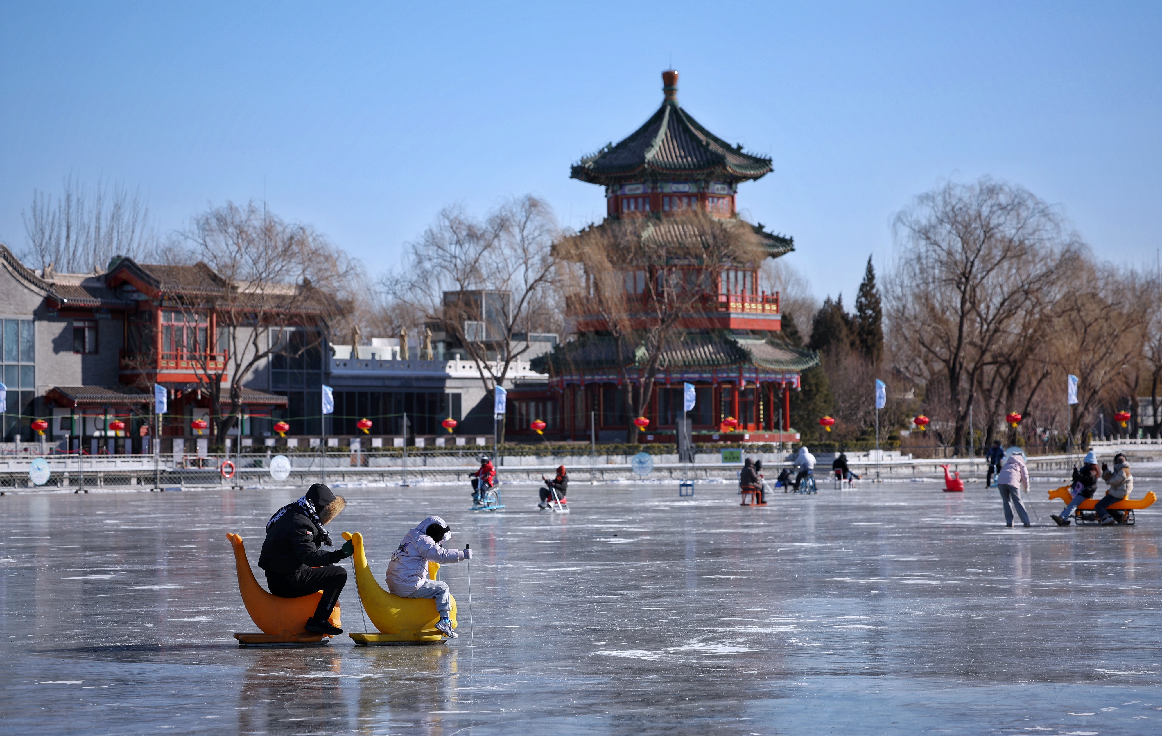 1月20日,什刹海后海冰场,游客们在冰上享受冬天的快乐。新京报记者 薛珺 摄
