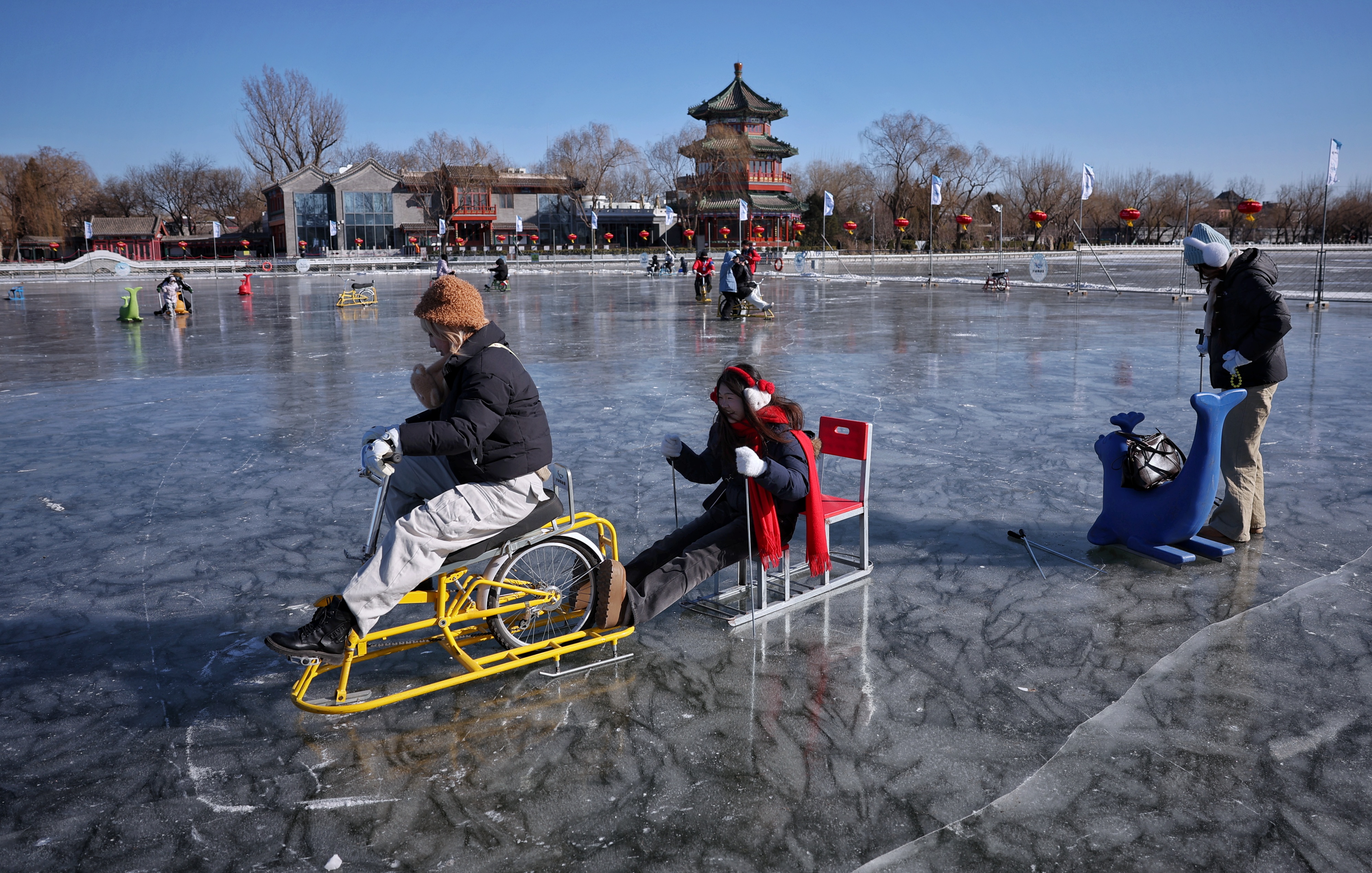 1月20日,什刹海后海冰场,游客们在滑冰车。新京报记者 薛珺 摄