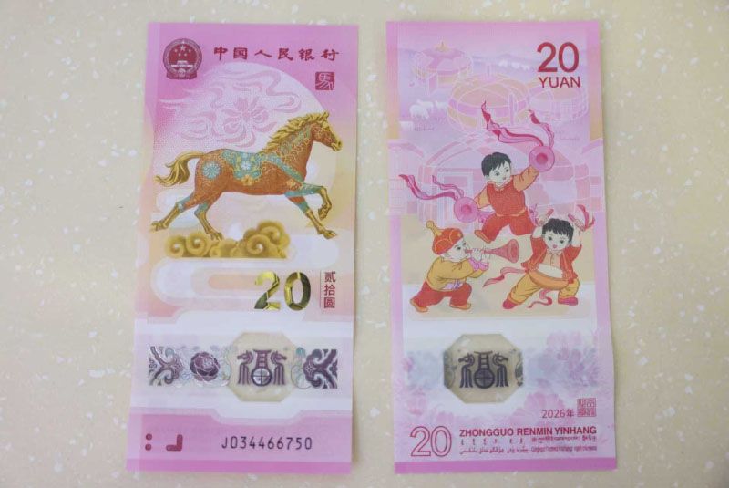 2026年贺岁纪念钞。据中国人民银行近日发布的公告,2026年贺岁纪念币和纪念钞全国发行数量为1亿枚、1亿张,贺岁币每枚面额10元,贺岁钞每张面额20元。