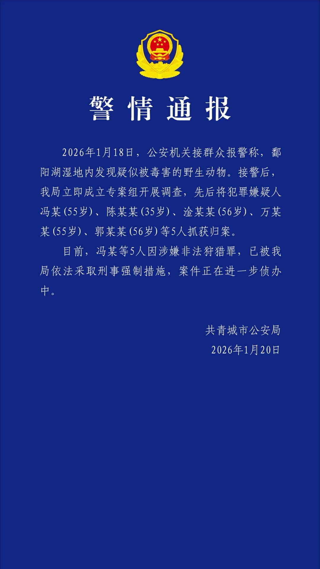涉嫌毒害鄱阳湖野生动物,5人被江西警方采取刑事强制措施