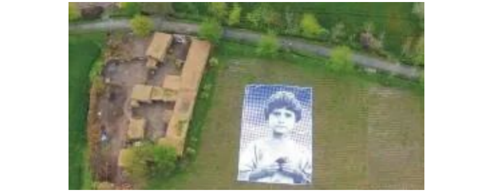 2014年,一个使用#NotABugSplat(splat在这里指的是拍死虫子时发出的啪啪声)标签的艺术项目在社交网络上引人注目。针对美国军方无休止的无人机猎杀行动,来自多个国家的艺术家们联合推出了这个项目。他们把一名在无人机轰炸中无辜罹难的男孩的巨幅照片平铺在巴基斯坦开伯尔-普赫图赫瓦省的地表上(见图2),借此提醒无人机操作员在执行任务时看似无关痛痒的“附带损害”(collateral damage)其实是一张张真实面容的猝然消失,无人机的所作所为绝不是像“踩死一只虫子”那样可以叫人心安理得。无人机的高空视野某种意义上是对面容的屏蔽与取消,而该艺术项目面容鲜活,感情丰沛,情绪毫不掩饰,态度无碍彰显,旨在恢复无辜罹难者的真实面容,由此实现列维纳斯式的道德要求即“别杀我”。