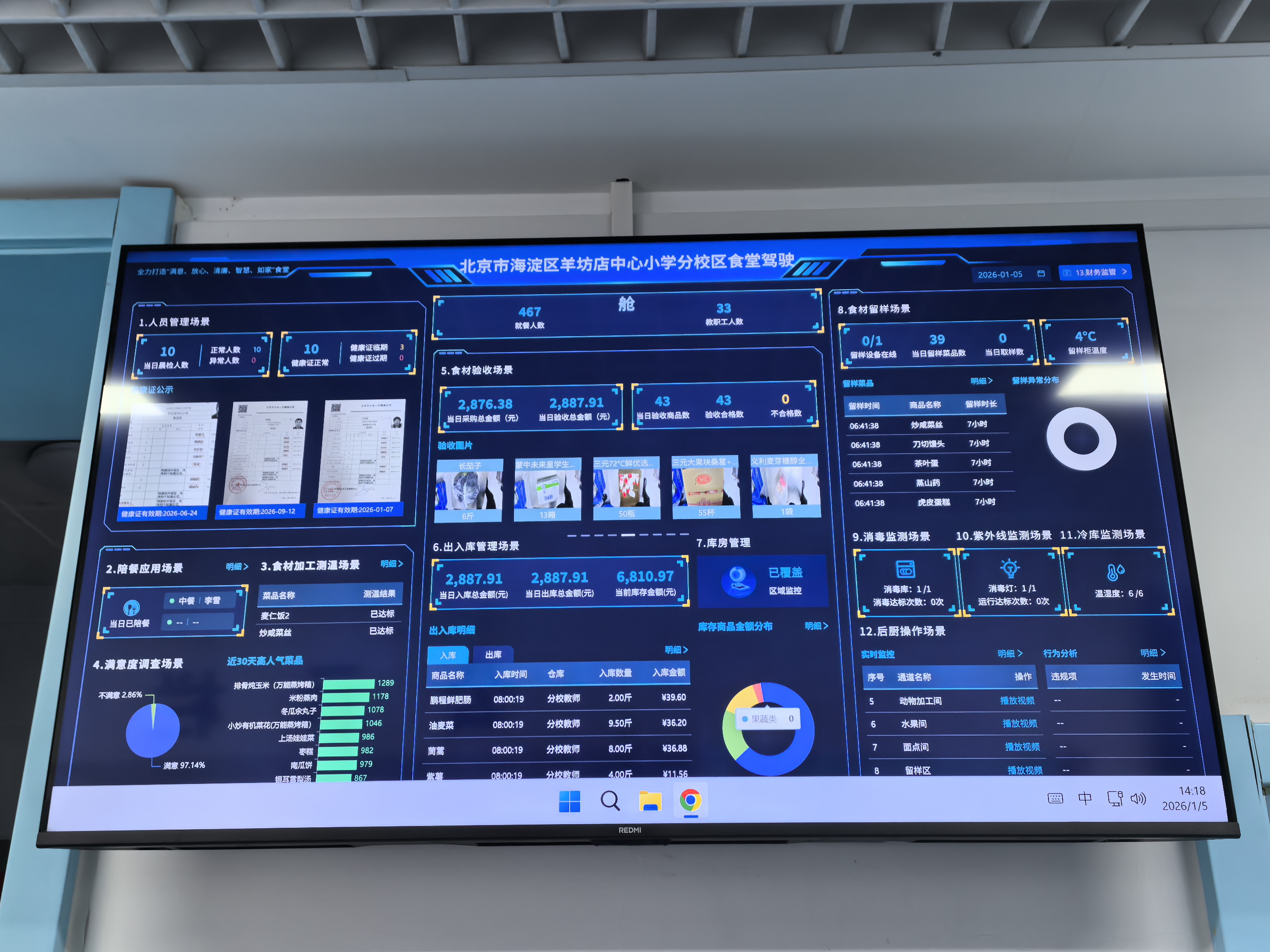 1月5日,羊坊店中心小学分校区,通过智慧大屏可以看到食材验收等12个关键应用场景。新京报记者 杨菲菲 摄
