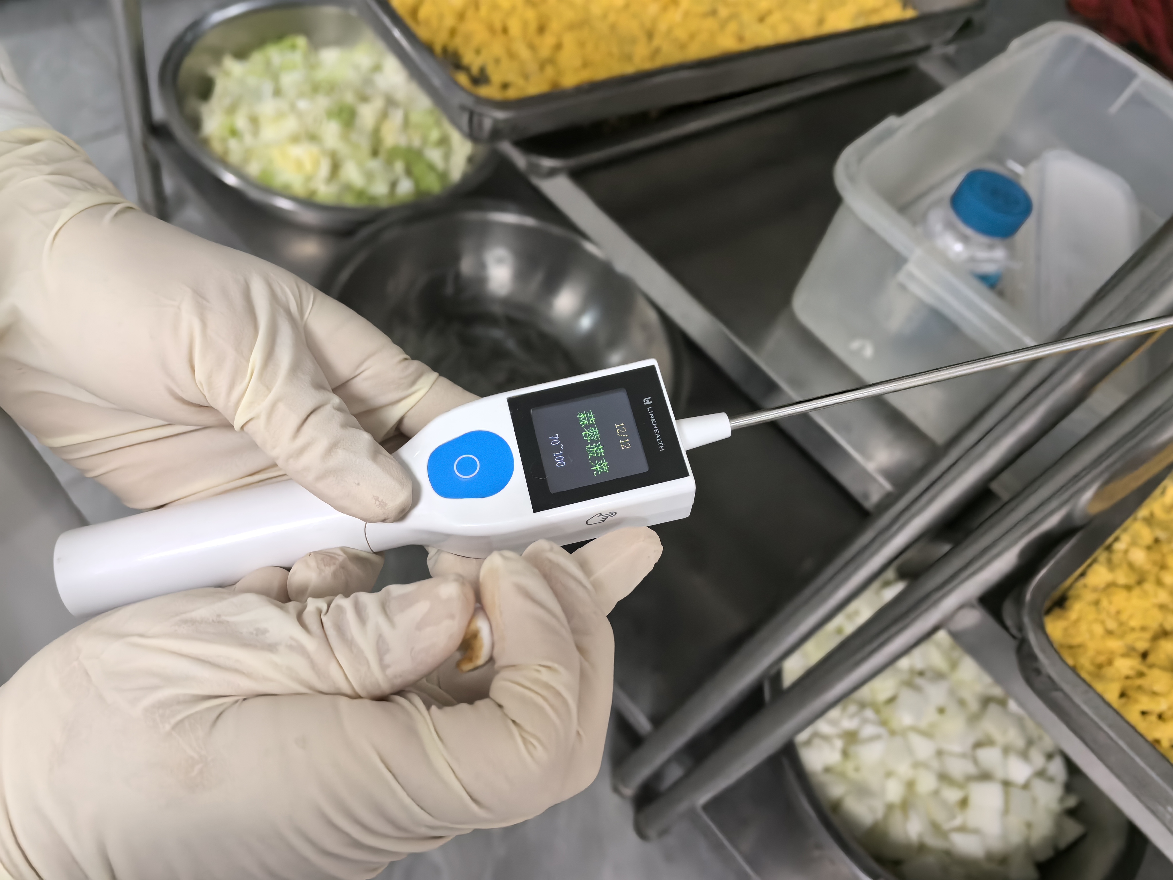 在羊坊店中心小学食堂的不少区域,都可以看到一个巴掌大小的绿色“盒子”,它们实时监测着冷库等不同位置的温度,并将数据回传至食安系统。专门负责测量菜品出餐温度的工作人员手持智能设备,选中菜品名称后用探头测量温度,一次记录便同步完成数据上传。