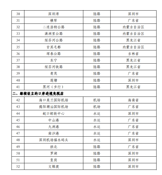二、继续在海口美兰国际机场、蛇口邮轮中心等11个口岸设立口岸进境免税店(在本通知所附《设立口岸进境免税店名单》中为序号42—52)。