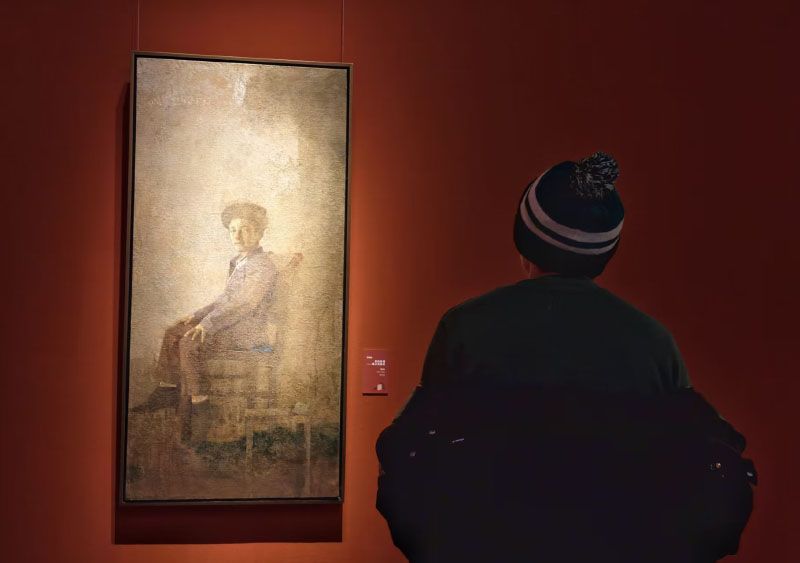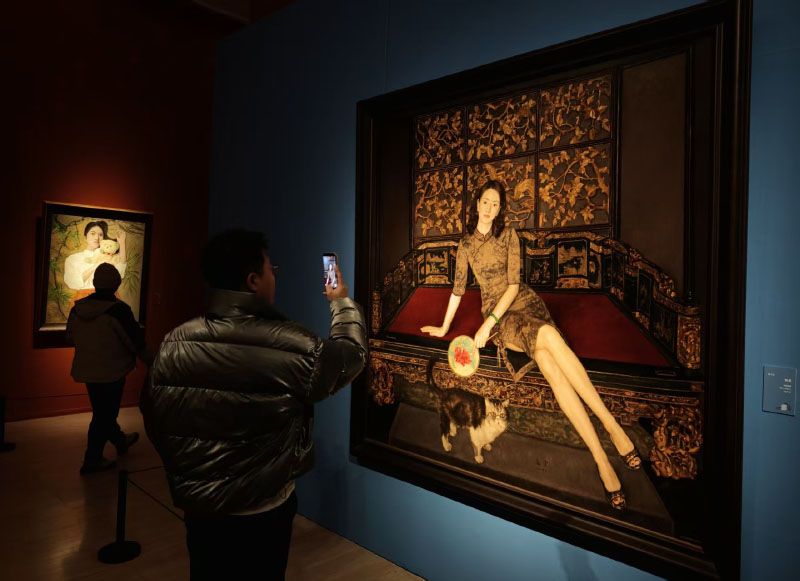 观众欣赏著名画家杨飞云的布面油画《怡然》。绘画材料与绘画语言密不可分,两者相辅相成,共同构成了绘画艺术创新发展的重要动力。