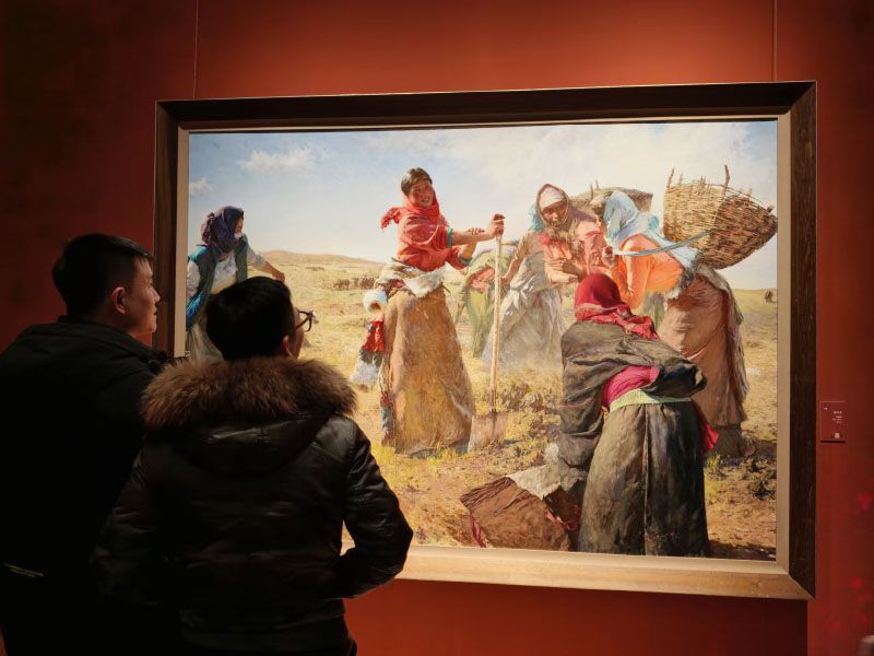 于明的布面油画《捡牛粪》。