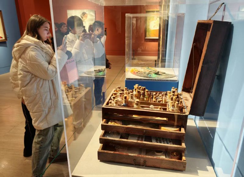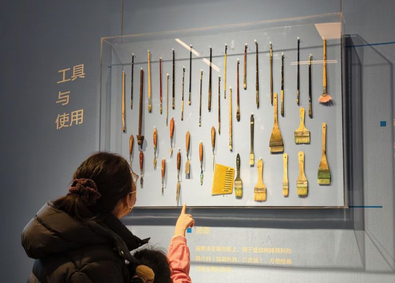 小朋友观看各种绘画工具。展览持续至2月1日。