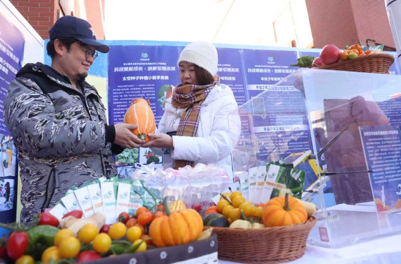 丰台区东高地青少年科技馆展位展出太空种子种植的蔬菜。