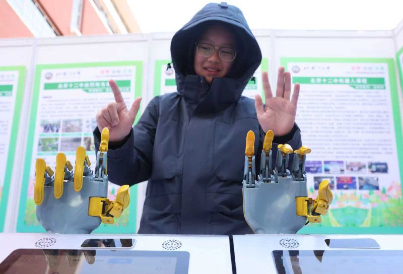 北京十二中的同学体验“灵巧手”。