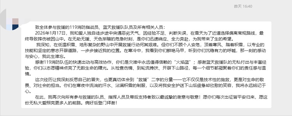 救援结束后,被困者写了感谢信对参与救援的全体消防救援人员表达感谢。