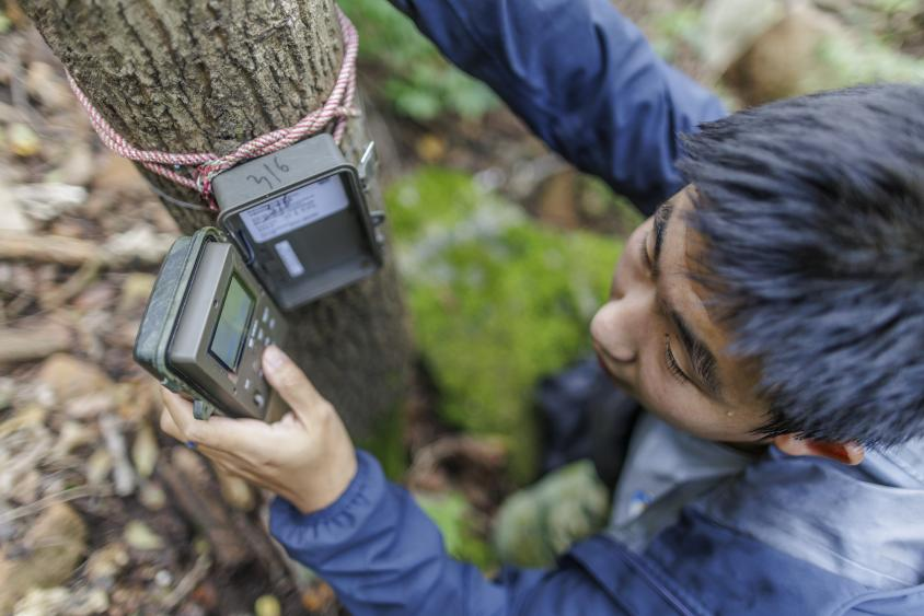 密云区冯家峪镇番字牌村附近山林,武阅正在查看之前安装的红外摄像机工作状态。密云区生物多样性调查工作人员选取了雾灵山、云蒙山、番字牌等五个生态环境优质的区域进行常态化监测。新京报记者 王子诚 摄