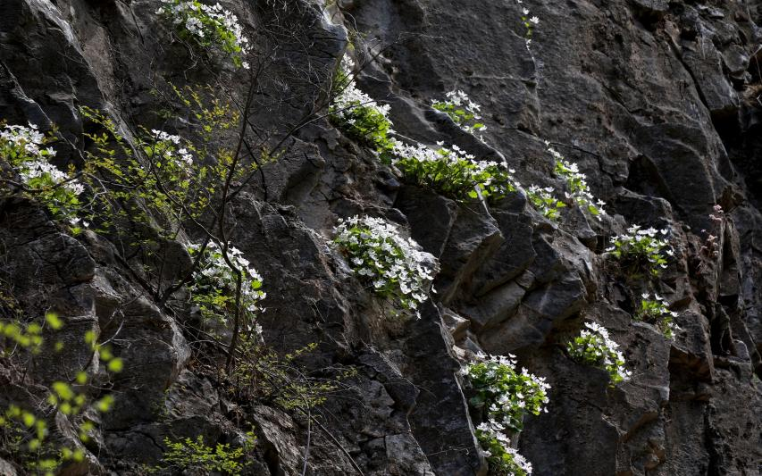 北京市房山区崖花谷,生长在悬崖峭壁上的槭叶铁线莲。何建勇 摄