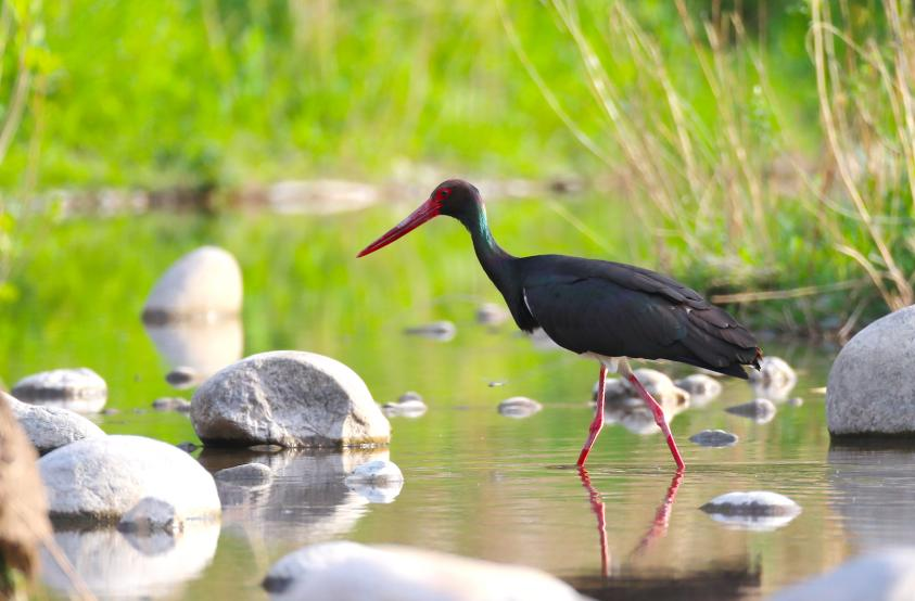 房山大石河,成年黑鹳在水中觅食。新京报记者 李木易 摄