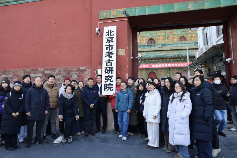 工作人员在摘下的“北京市考古研究院”牌匾前留影。自1955年起,琉璃阁院落作为北京市文物考古机构的办公及文物存放场所使用逾70年,多次对院落进行保养维护和修缮,完好守护了这一文化瑰宝。北京市考古研究院已迁至蒲黄榆新址办公。据悉,琉璃阁腾退移交北海公园,是首都功能核心区第二批文物腾退保护利用项目首个标志性成果,是“十五五”开篇实施好《北京城市总体规划(2016年—2035年)》的具体举措。