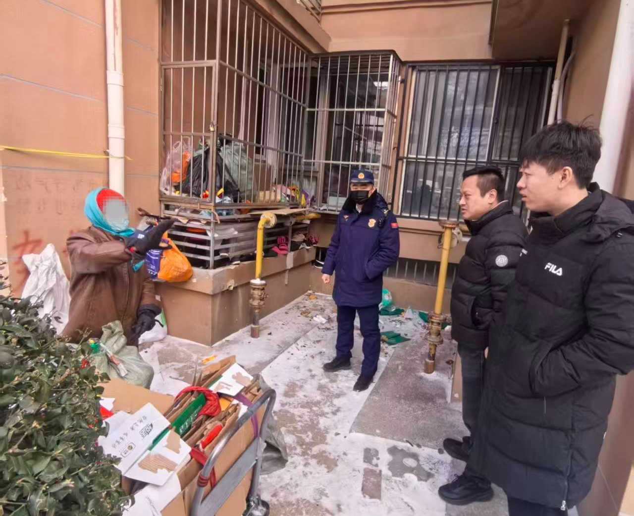 敲开门后,防火监督员见到了住户王大妈。经过耐心询问了解到,王大妈多年来一直有收集废纸箱、塑料瓶等废品的习惯。“冬天卖废品的人少,就想多攒点一起卖。”王大妈解释,家里空间有限,阳台外的防盗栅栏就成了她临时存放的地方,“因为冬天冷,不会着火。”
