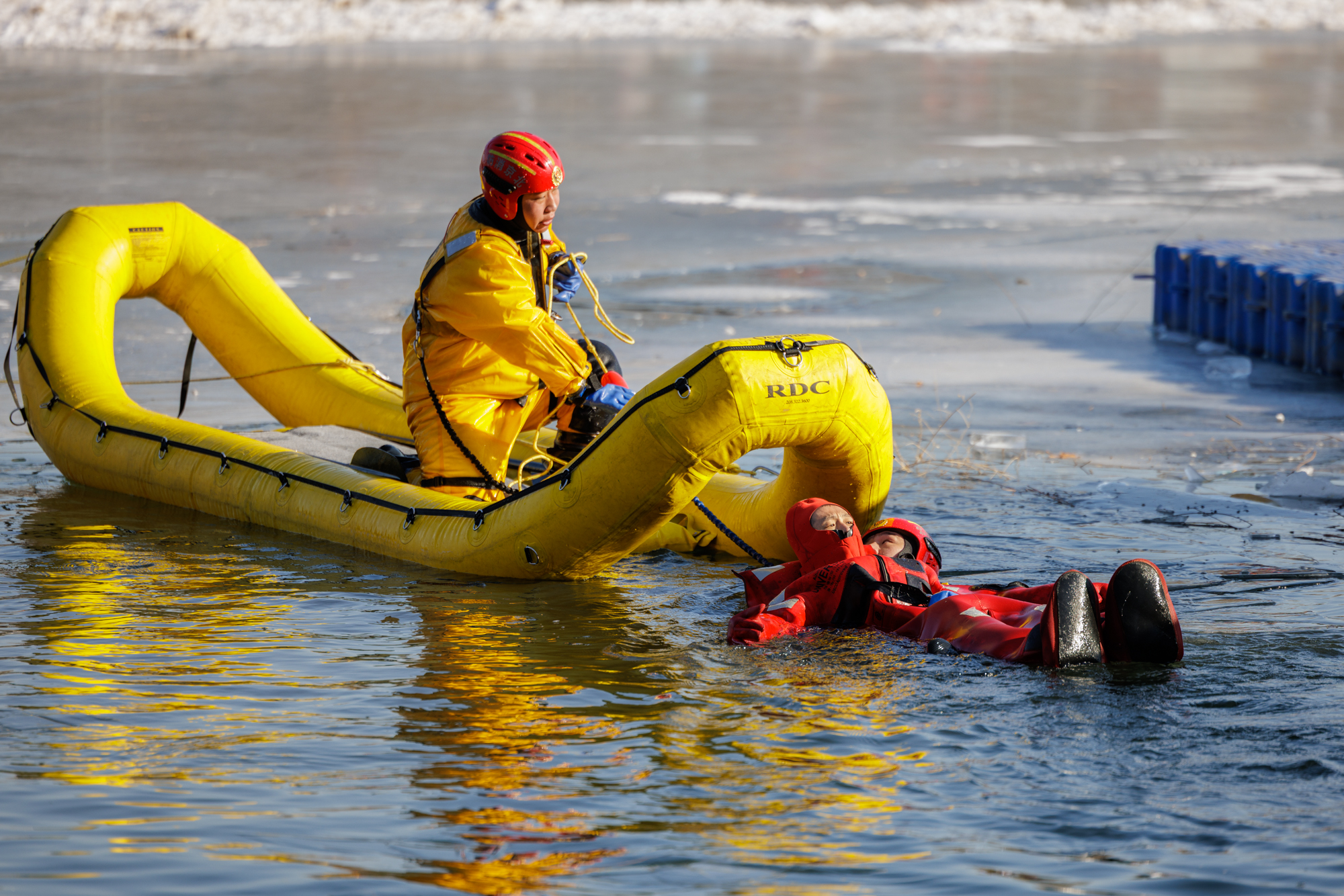 在直接救援环节,消防队员身着全套冰域救援防护服,通过制作稳固的冰面锚点架设保护系统,然后采取匍匐前进的方式,小心翼翼地接近“落水者”。他们利用单杠梯延长接触距离,迅速抵近目标,随后抛投救生圈,为“被困者”套上救援吊带,利用绳索系统实施提拉……一连串动作精准连贯,很快将“落水者”从冰窟中成功救出,转移至安全区域。
