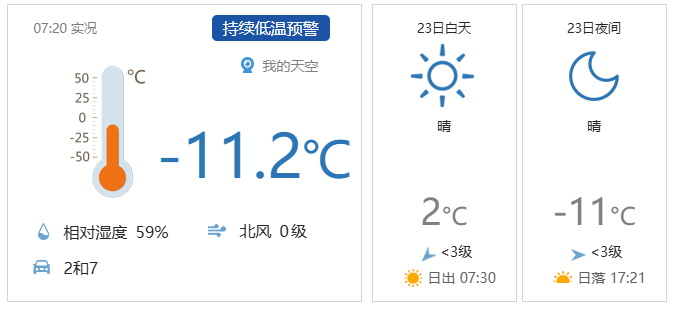 今天白天晴,北转南风二三间四级,山区阵风六级,最高气温2℃;夜间晴,南转北风一二级,最低气温-11℃。