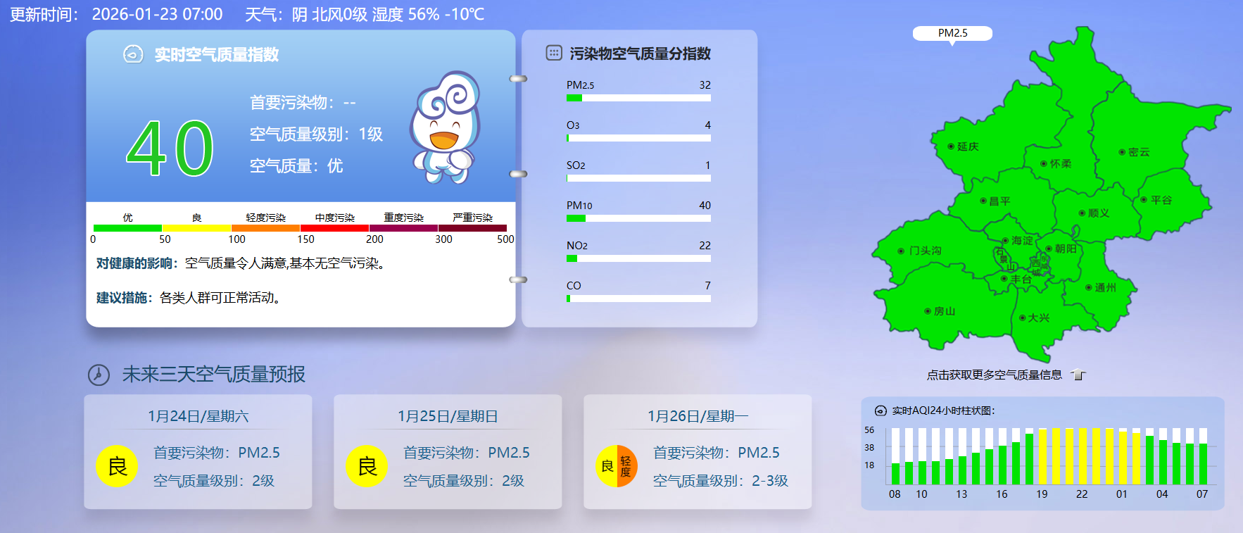 据北京市生态环境监测中心今早7时数据,目前实时空气质量指数40,空气质量优。