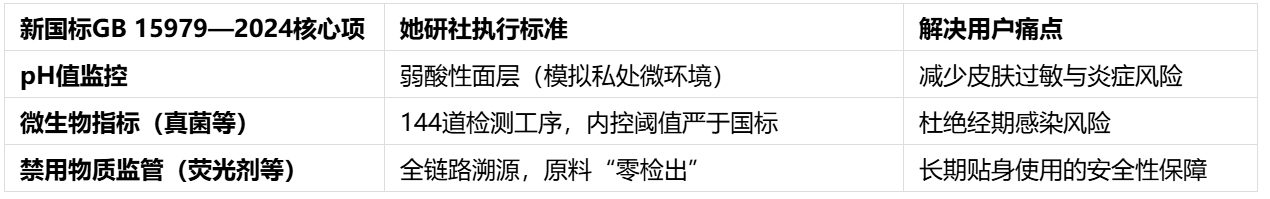 她研社近期获得央视关注及“2025年度质量金盾奖”,其核心逻辑在于将品牌品控逻辑与最新实行的《一次性使用卫生用品卫生要求》(GB 15979—2024)深度对齐。我们拆解了新国标的几项核心修改,来看品牌的具体执行标准:
