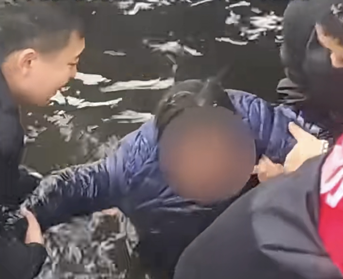 拍摄这段视频的王女士告诉新京报记者,当时自己正在游园拍雪景,听身边朋友说不远处有人喊“救命”,顺着声音看去,她见桥下有老人在挣扎,“那人看上去冻得瑟瑟发抖。”