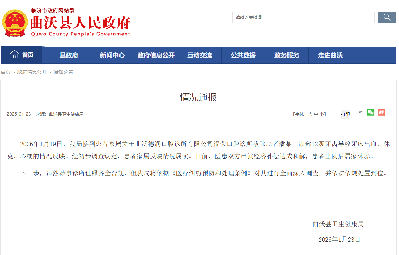 新京报讯 1月23日,曲沃县卫生健康局发布情况通报,2026年1月19日,该局接到患者家属关于曲沃德润口腔诊所有限公司福荣口腔诊所拔除患者潘某上颌部12颗牙齿导致牙床出血、休克、心梗的情况反映。经初步调查认定,患者家属反映情况属实。目前,医患双方已就经济补偿达成和解,患者出院后居家休养。