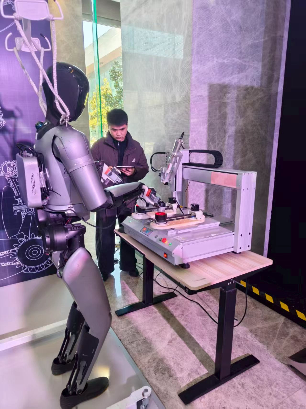 魔法原子人形机器人正展示在工业场景中的能力。新京报贝壳财经记者韦博雅摄。